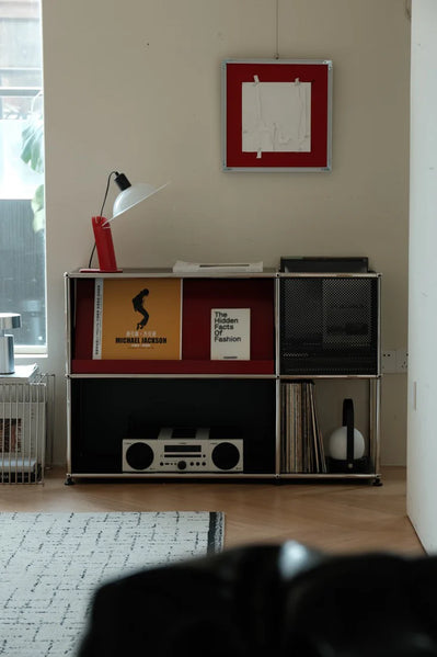 he Perfect Centerpiece for My Vinyl Collection!! I am absolutely thrilled with this Record & Media Cabinet. I was looking for something that felt both modern and timeless, and this is it. The black finish is incredibly chic and has a real "light luxury" feel—it just looks so sharp and sophisticated against the polished steel frame. It’s the perfect setup. My turntable fits beautifully on top, and the perforated side cabinet is a dream for organizing my vinyl collection, while the smaller cubby is perfect for my magazines. It’s a solid, high-quality piece that has completely elevated the entire vibe of my listening space. 5 stars, easily.