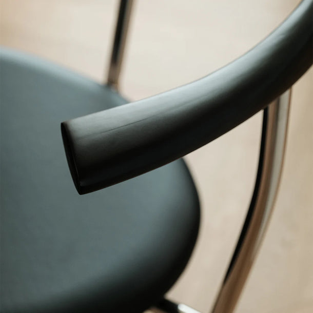Combining steam-bent wood arms, an elliptical wood backrest, and sleek electroplated steel legs, it creates a striking industrial silhouette without sacrificing comfort.
