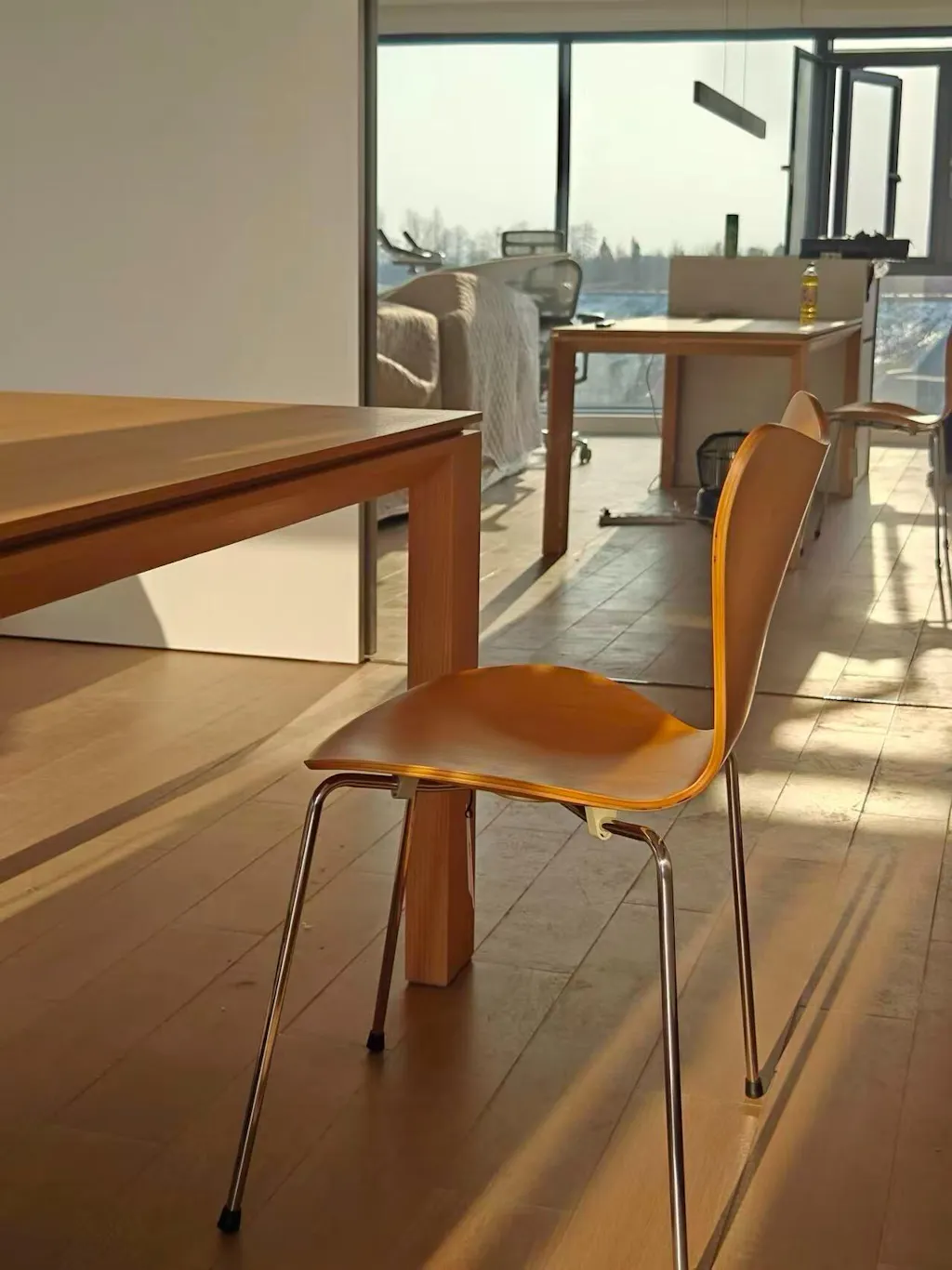 Crafted from sleek molded plywood with a smooth stainless steel frame, this wooden chair is all about balance—lightweight yet strong, minimalist but expressive. Its fluid curves cradle the body naturally, offering lasting comfort whether you're using it as a modern dining chair, a casual lounge chair, or that go-to piece that always feels just right.