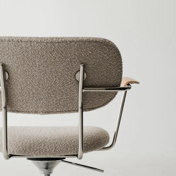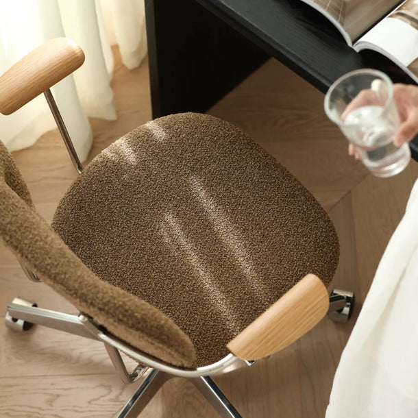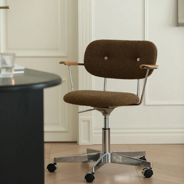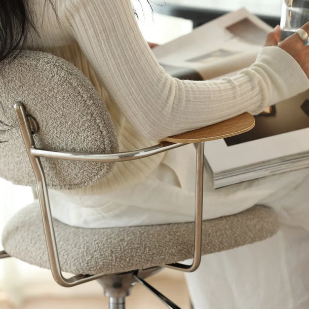 Unlike stiff, traditional armrests, 'Liv's' are shaped as flowing, multi-dimensional curves. They are precisely sculpted to echo the natural path of your arm's movement and rest. Topped with a warm wood finish, they provide a tactile, organic contrast that beautifully balances the cool, sleek feel of the metal frame.